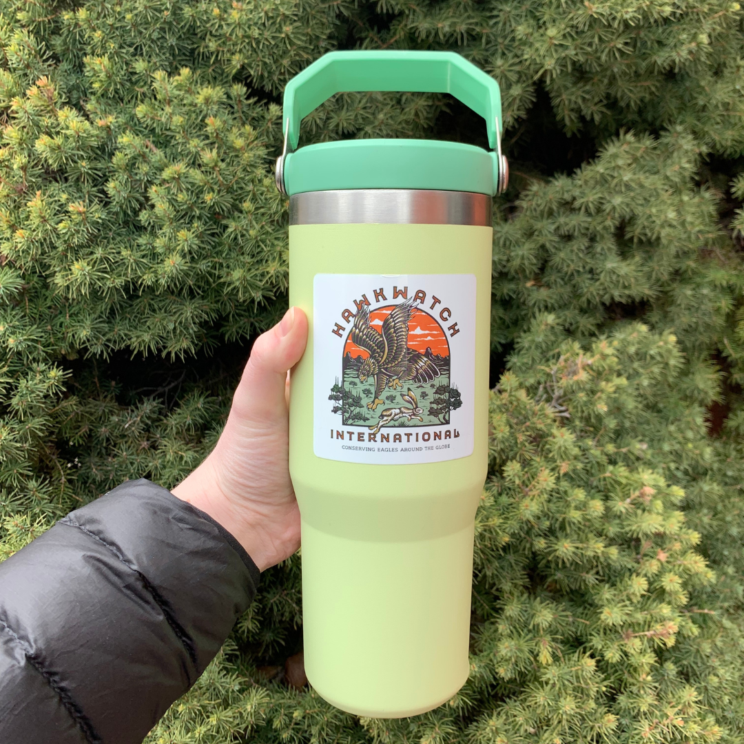 By purchasing this sticker, you are helping us conserve eagles around the globe. This beautiful piece designed by Brett Rees is inspired by American traditional tattoos and Western pulp. Featured is the majestic Golden Eagle hunting for jackrabbits surrounded by sagebrush. Show your support for the cause by slapping this die-cut sticker on your laptop, your water bottle, or even your car! This sticker is durable enough to hold up to the elements.